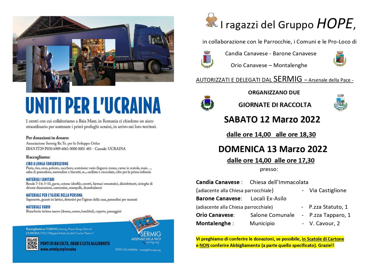 Si comunica che il Comune, la Parrocchia e la Pro-loco di Montalenghe, in collaborazione con quelli di Candia, Barone e Orio, sulla base di un progetto dei ragazzi del gruppo HOPE, organizzeranno due giornate di raccolta sabato 12 (ore 14:00-18:30) e domenica 13 (ore 14:00/17:30) marzo a favore dei rifugiati ucraini.