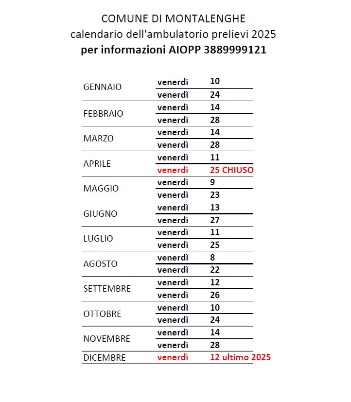 Si comunica il calendario dei giorni in cui verranno eseguiti i prelievi del sangue presso l'ambulatorio sito in Via Cavour.