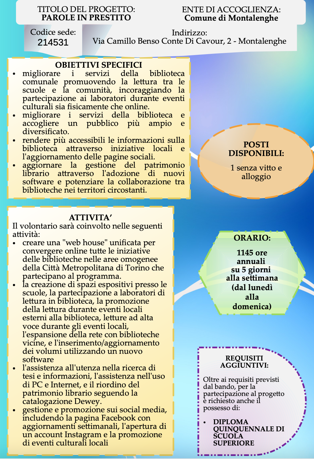 Per aderire al nostro progetto, che si chiama “Parole in Prestito” si entra nel sito della Città Metropolitana di Torino, Servizio Civile Ordinario, Bando 22 dicembre 2023.