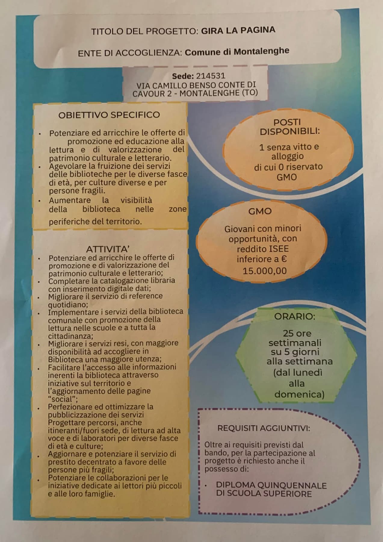 Per il nostro, che è relativo a biblioteche e cultura, si clicca su “Gira la Pagina”; il codice della nostra Sede è 214531. Sulla scheda di sintesi allegata, si possono vedere le specifiche del progetto. Per dettagli, potete contattare il numero dello Sportello Innovazione e Sviluppo del nostro Comune. Il Servizio Civile è un'importante occasione di crescita personale e professionale ed una prima esperienza utile per avvicinarsi e confrontarsi col mondo del lavoro. La Città Metropolitana di Torino prevede inoltre un rimborso spese mensile.