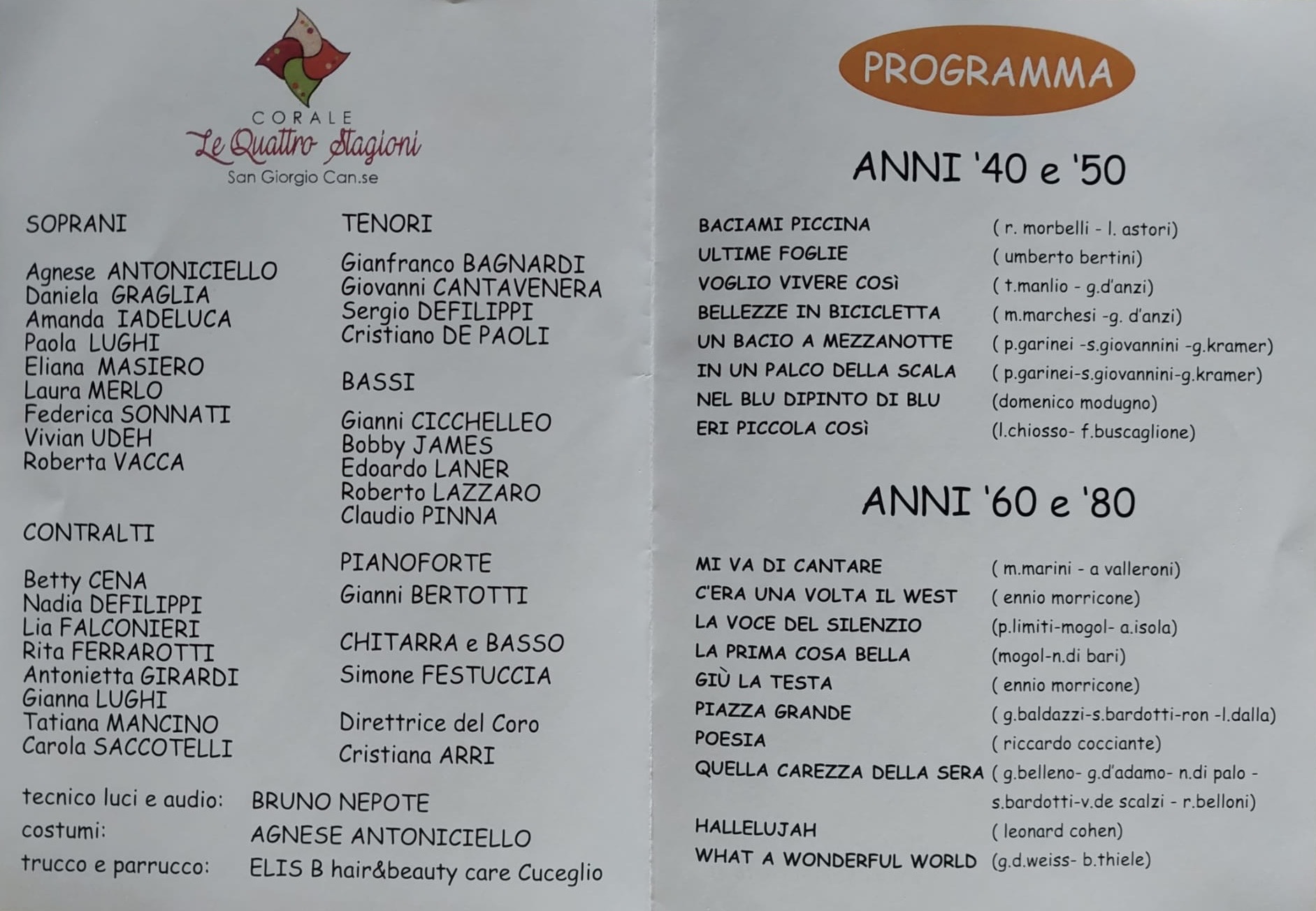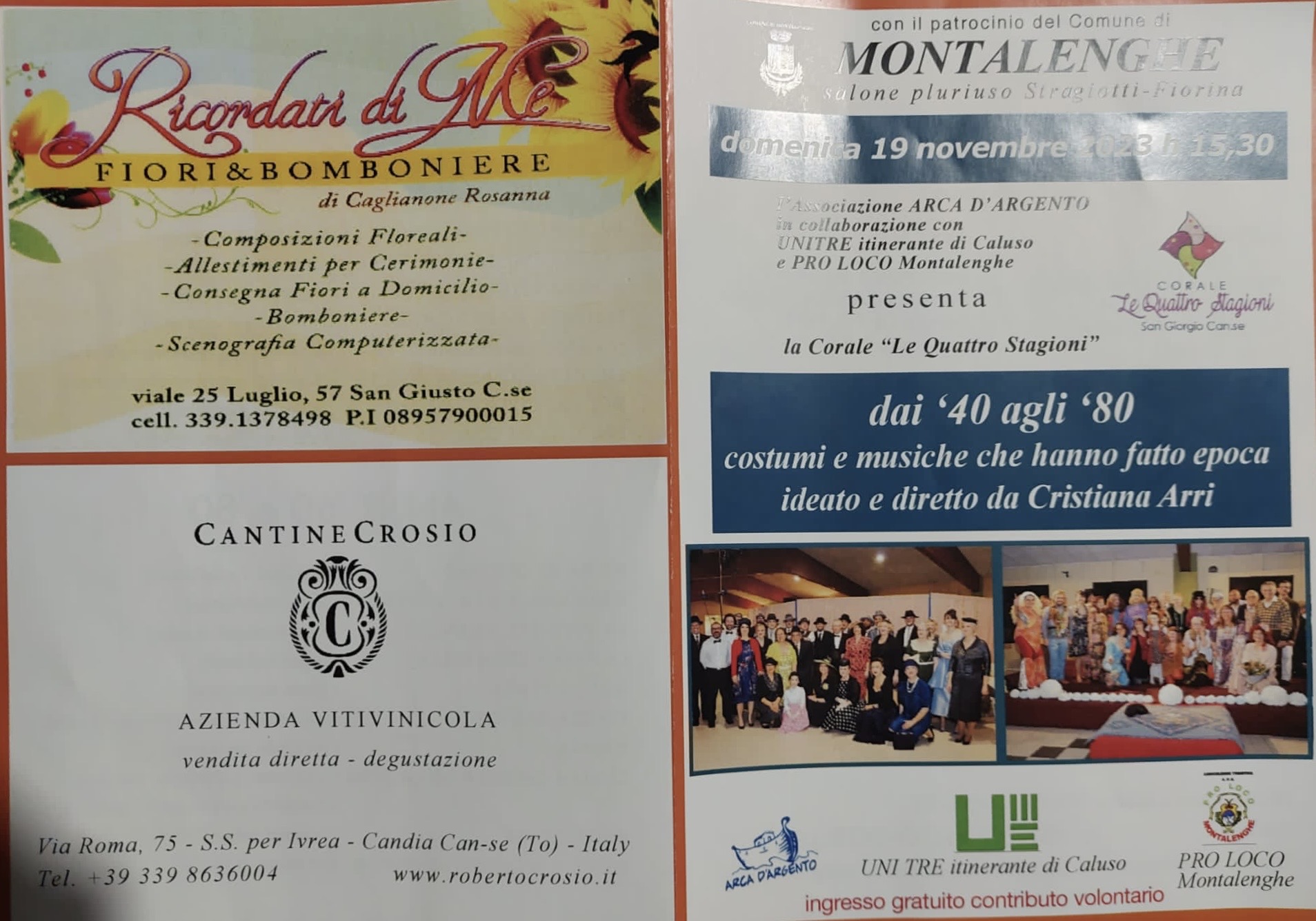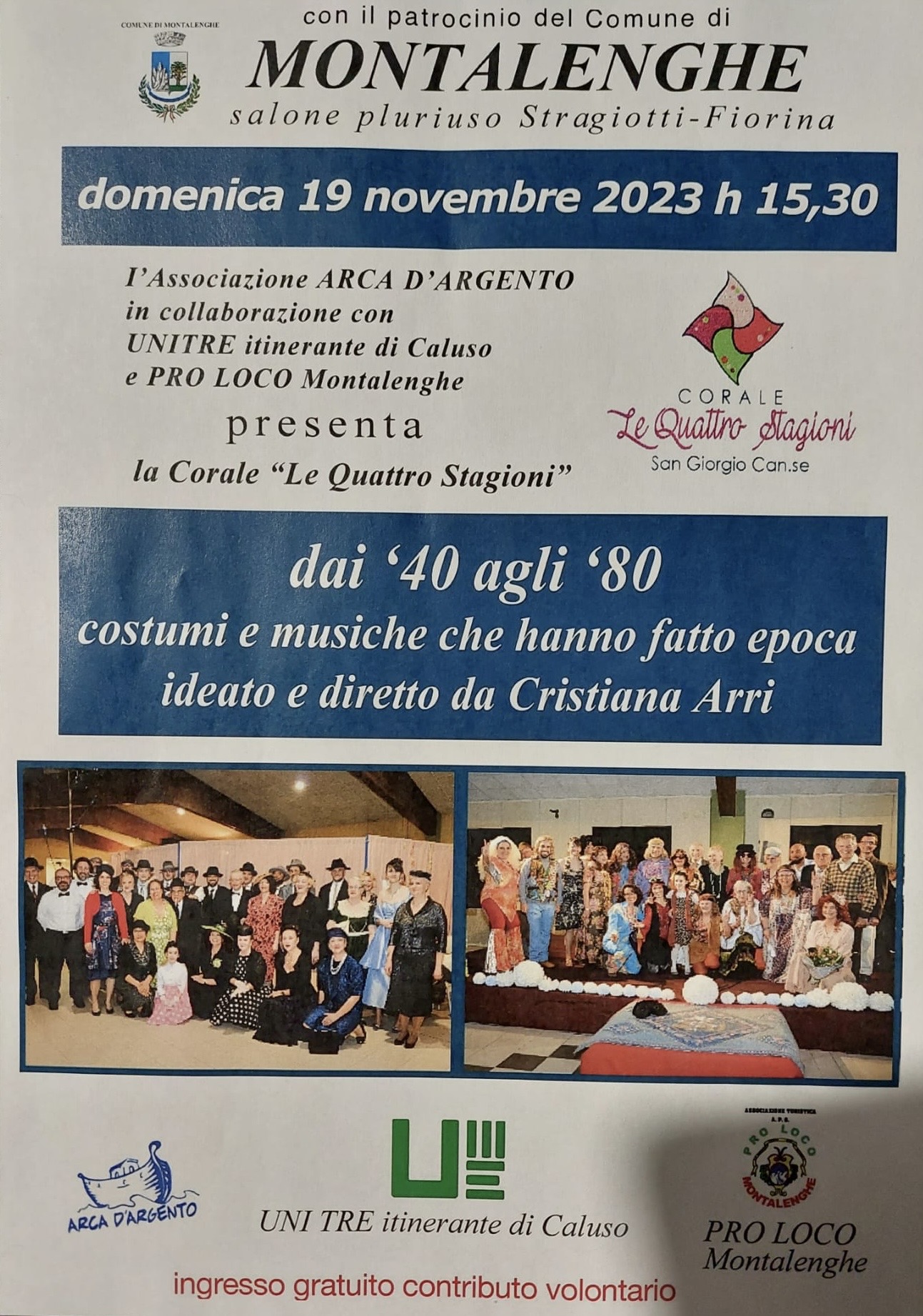 Domenica 19 novembre 2023, alle ore 15:30, presso il salone polivalente di Montalenghe sito in piazza XXV aprile, la corale "Le Quattro Stagioni" ci delizierà con uno spettacolo canoro in costume dedicato alle più belle canzoni degli anni '40, '50, '60, '70 e '80.