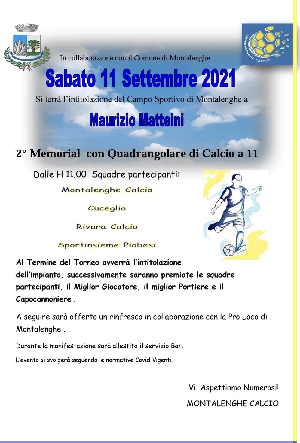L'Amministrazione di Montalenghe, in collaborazione con il Montalenghe Calcio e la Pro Loco Montalenghe, ha il piacere di invitare tutti i cittadini a prender parte alla cerimonia di intitolazione del Campo sportivo a Maurizio Matteini; la stessa seguirà il quadrangolare che vedrà coinvolti il Cuceglio, il Rivara Calcio e la Sportinsieme Piobesi oltre, ovviamente alla nostra squadra locale.