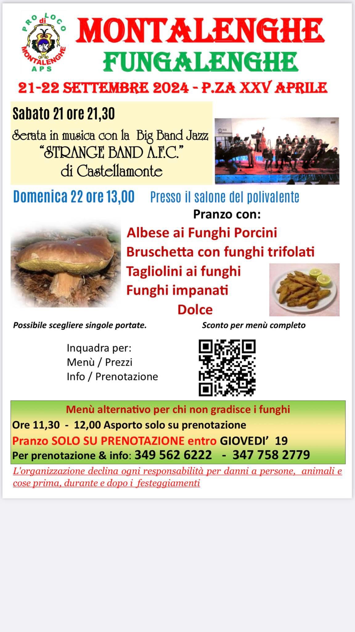 Per info, menù e prenotazioni telefonare a: 349 562 6222 - 347 758 2779 entro giovedì 19 settembre, oppure inquadrare il QR code presente sul volantino.